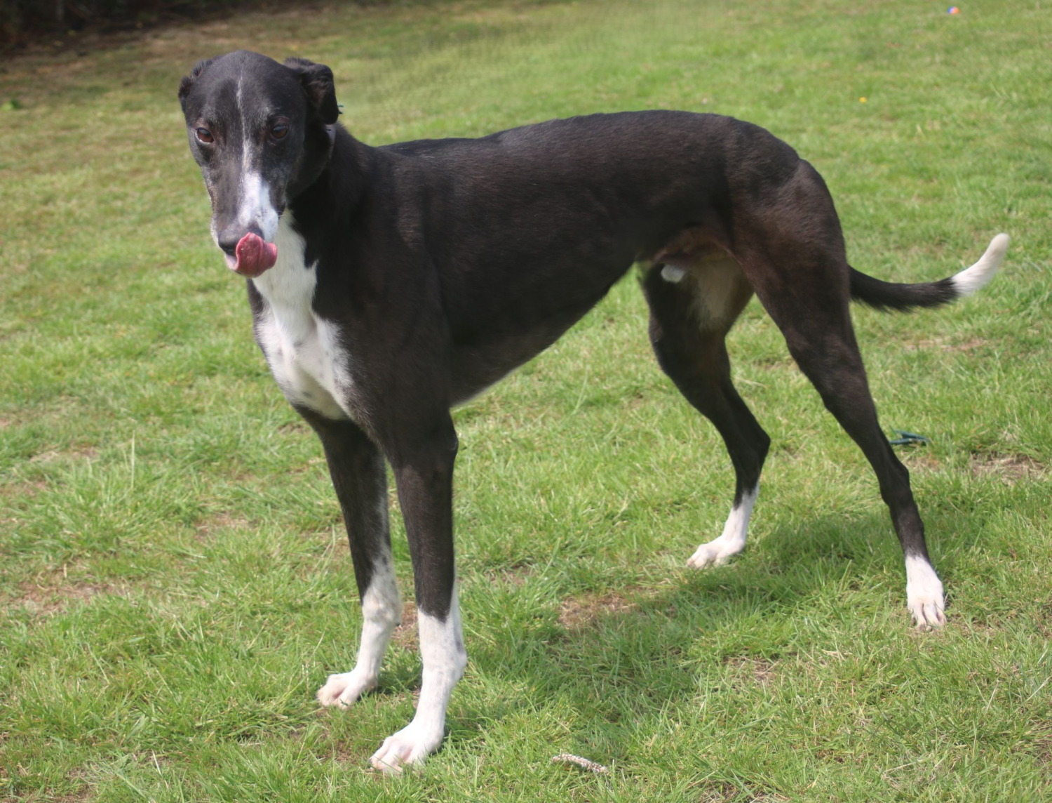 This handsome black & white 4 year old is settling into retired life, so can be a little bouncy when he first sees a volunteer approaching with a lead, but soon calms down once he gets on his walk. He absolutely loves paddock time and zooms round and round, having a greyt time.