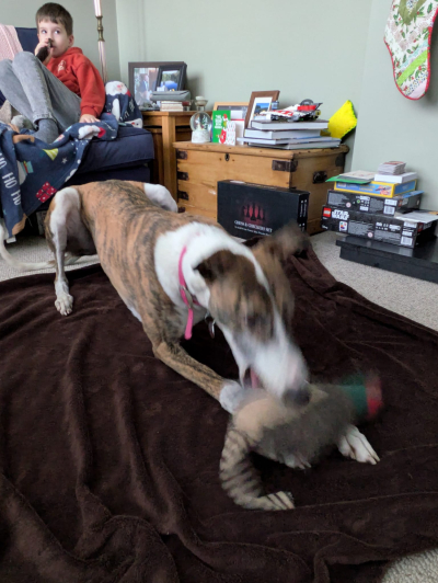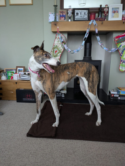 Another of her hobbies is watching squirrels from the safety and warmth of the indoors. Outdoors she walks beautifully on the lead, likely because she’s saving her energy for the next fire-side nap. She’s more of a silent observer than a barker (unless a squirrel does something particularly suspicious)