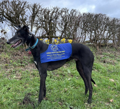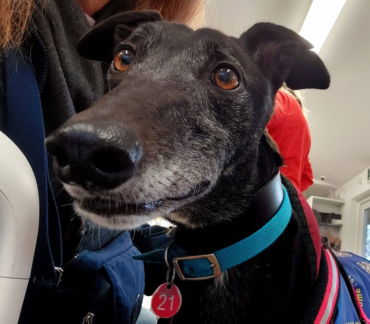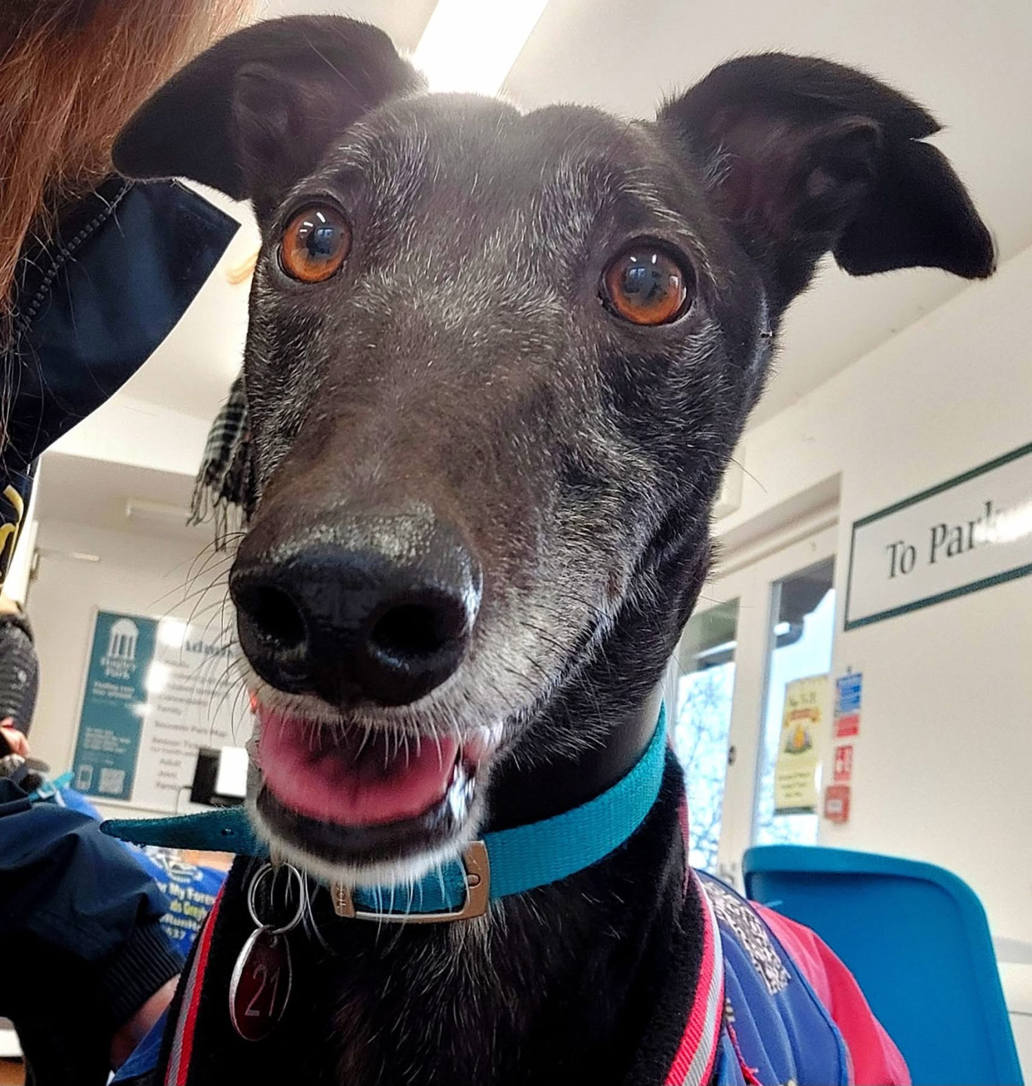 Out and about, Miller shows interest in other dogs and can be reactive at times, but he is manageable with the right handling. He sometimes steps back when unsure, needing reassurance before moving forward, showing a thoughtful and cautious approach to new experiences. He took in the park environment well overall, and even joined us for some awareness raising alongside other greyhounds.