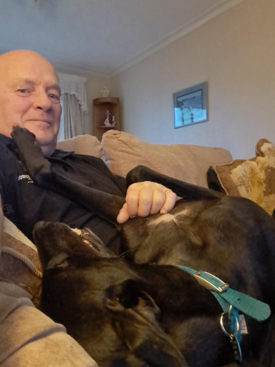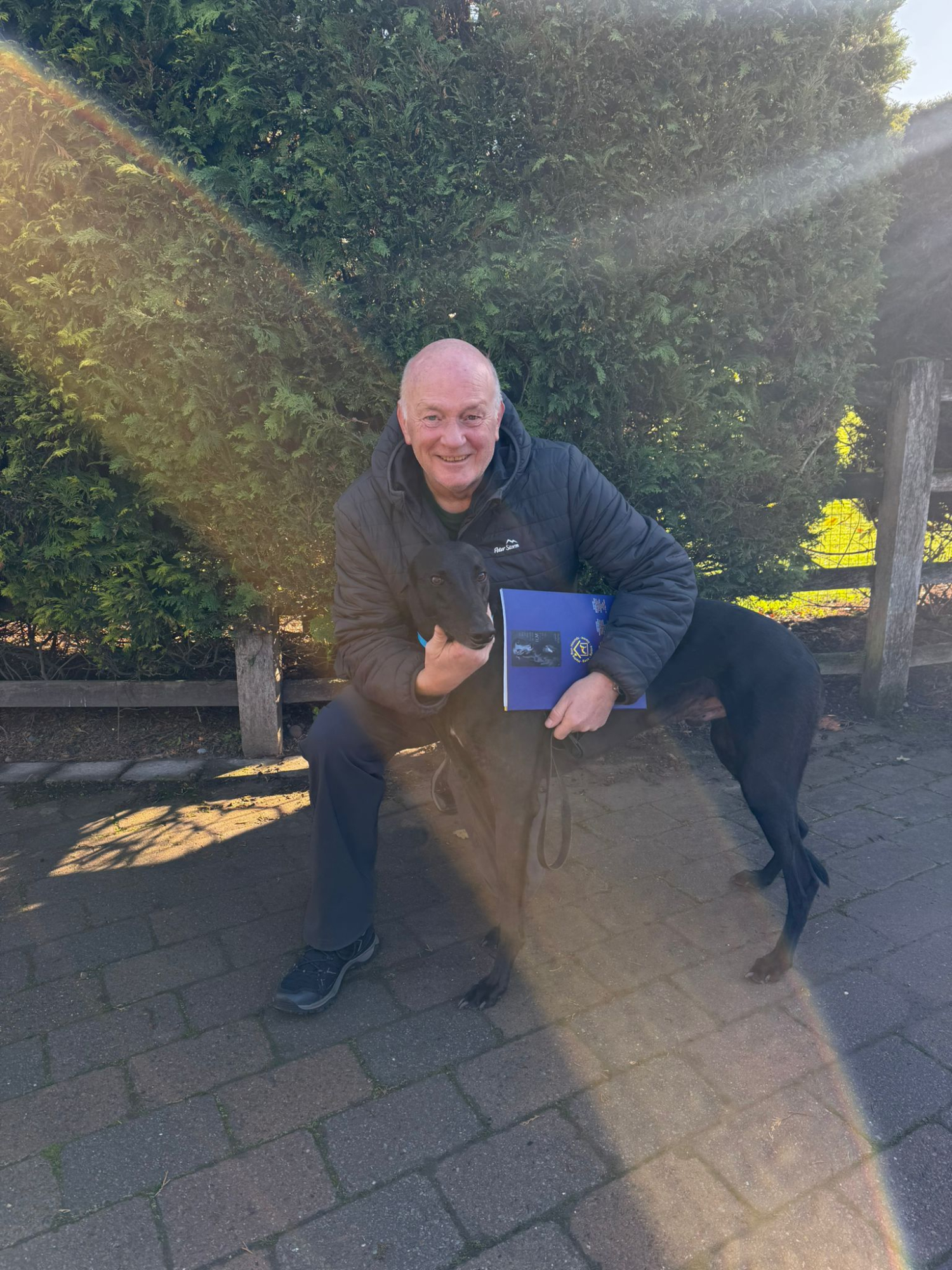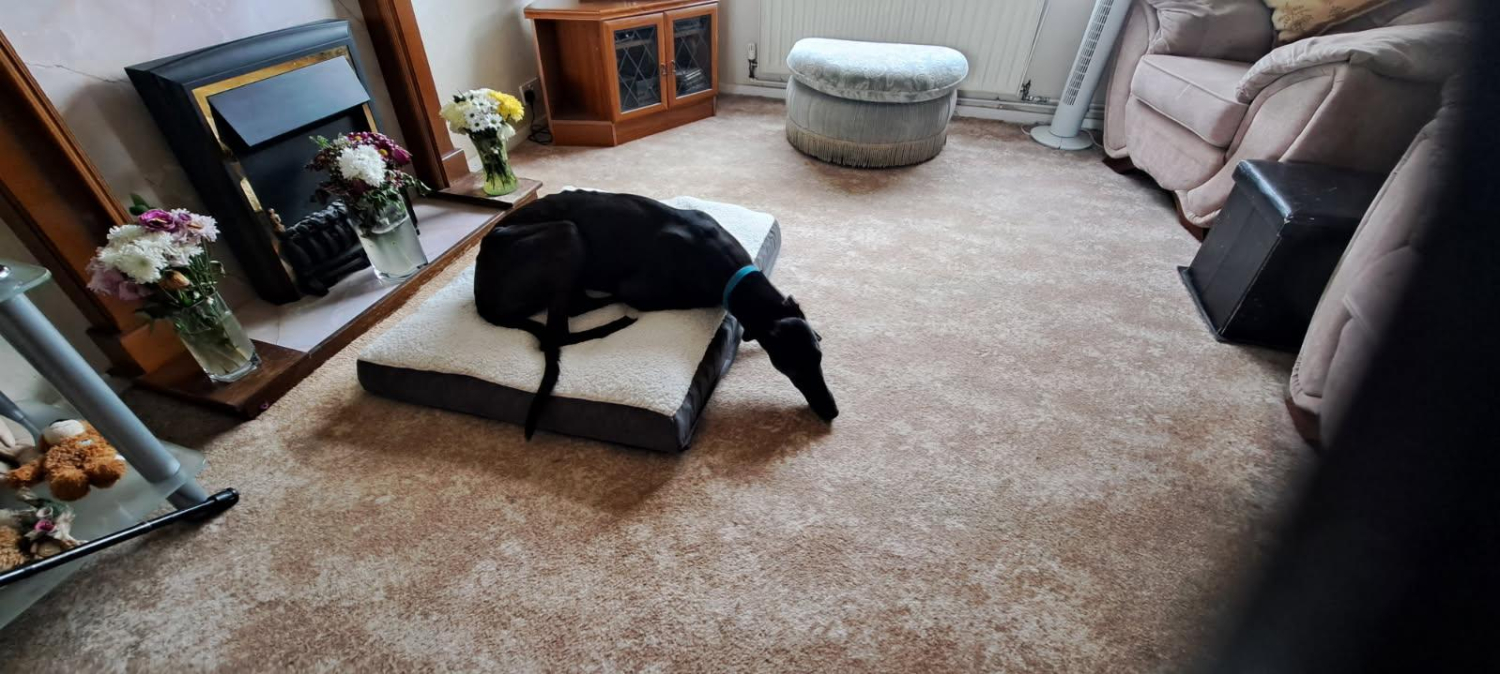 Jon contacted us as the family had lost elderly greyhound, Messenger Boy, who had kept his Mum company for 7 years. Despite being in her 90s, Jon’s Mum couldn’t live without a greyhound in her life to keep her company so he wondered if we had a suitable dog to be treated like a king, after a quick think, Arnie was the perfect candidate as he had lived in a home so understood what retirement was all about.