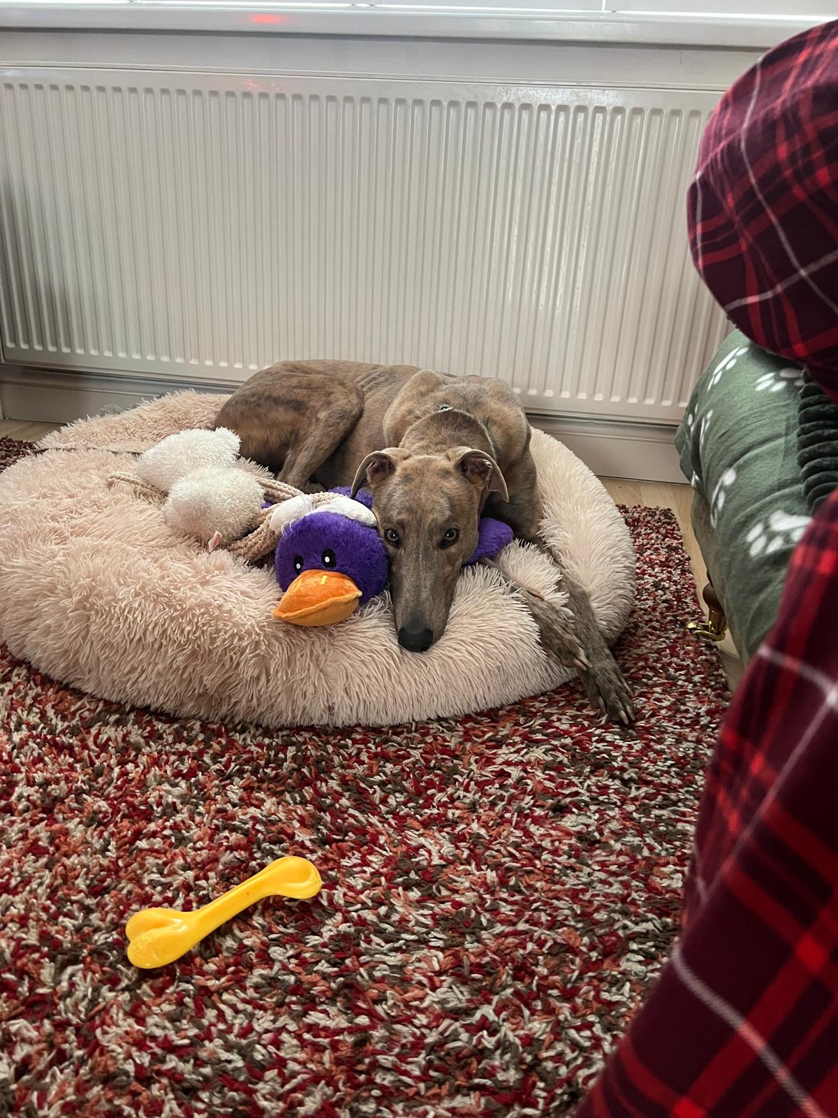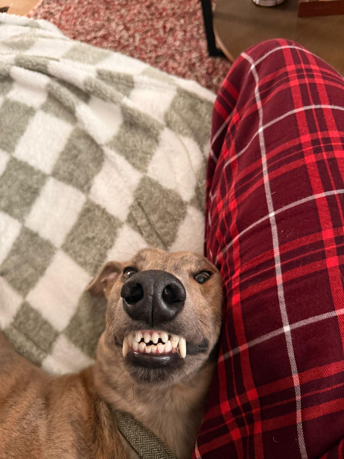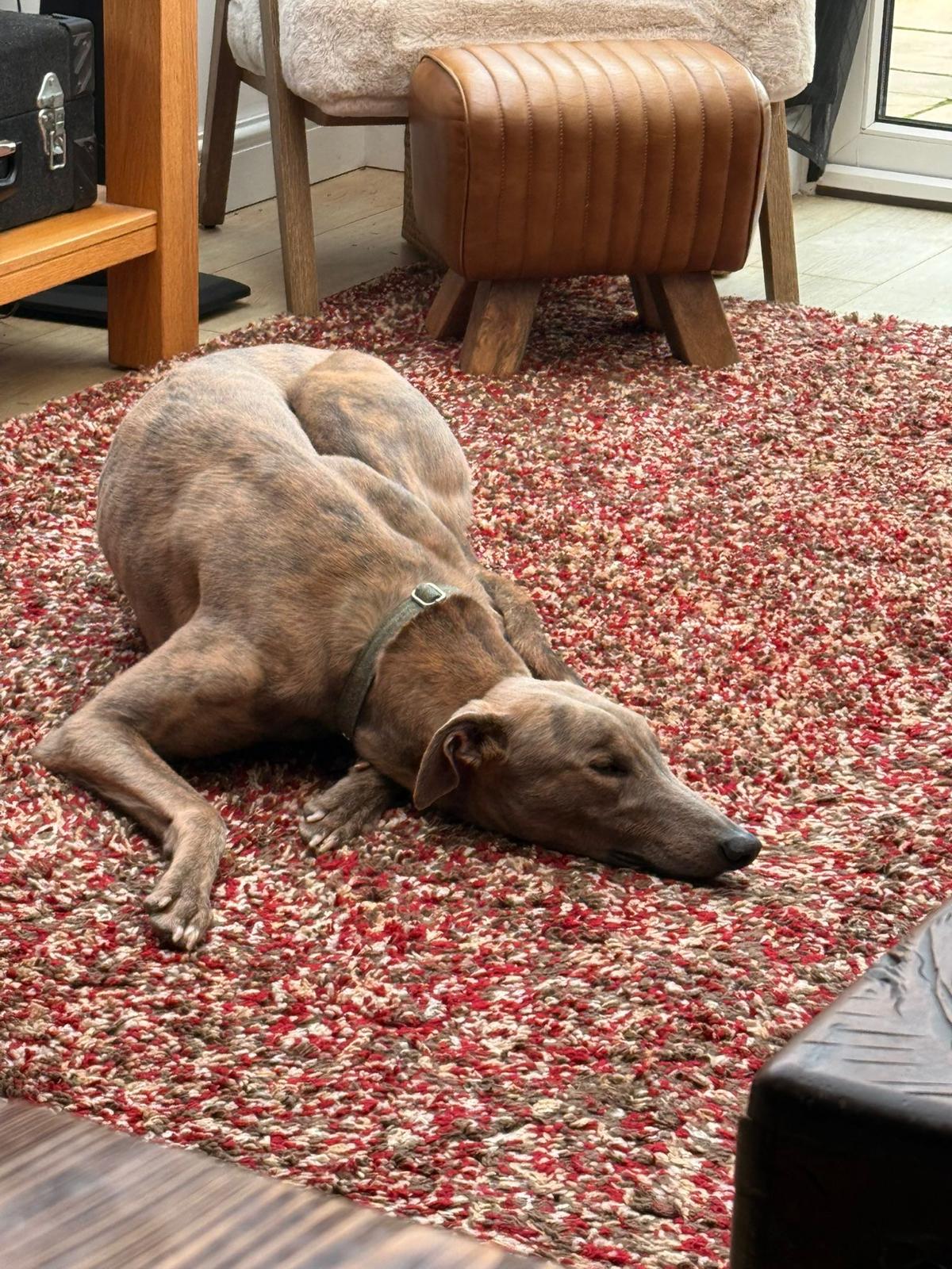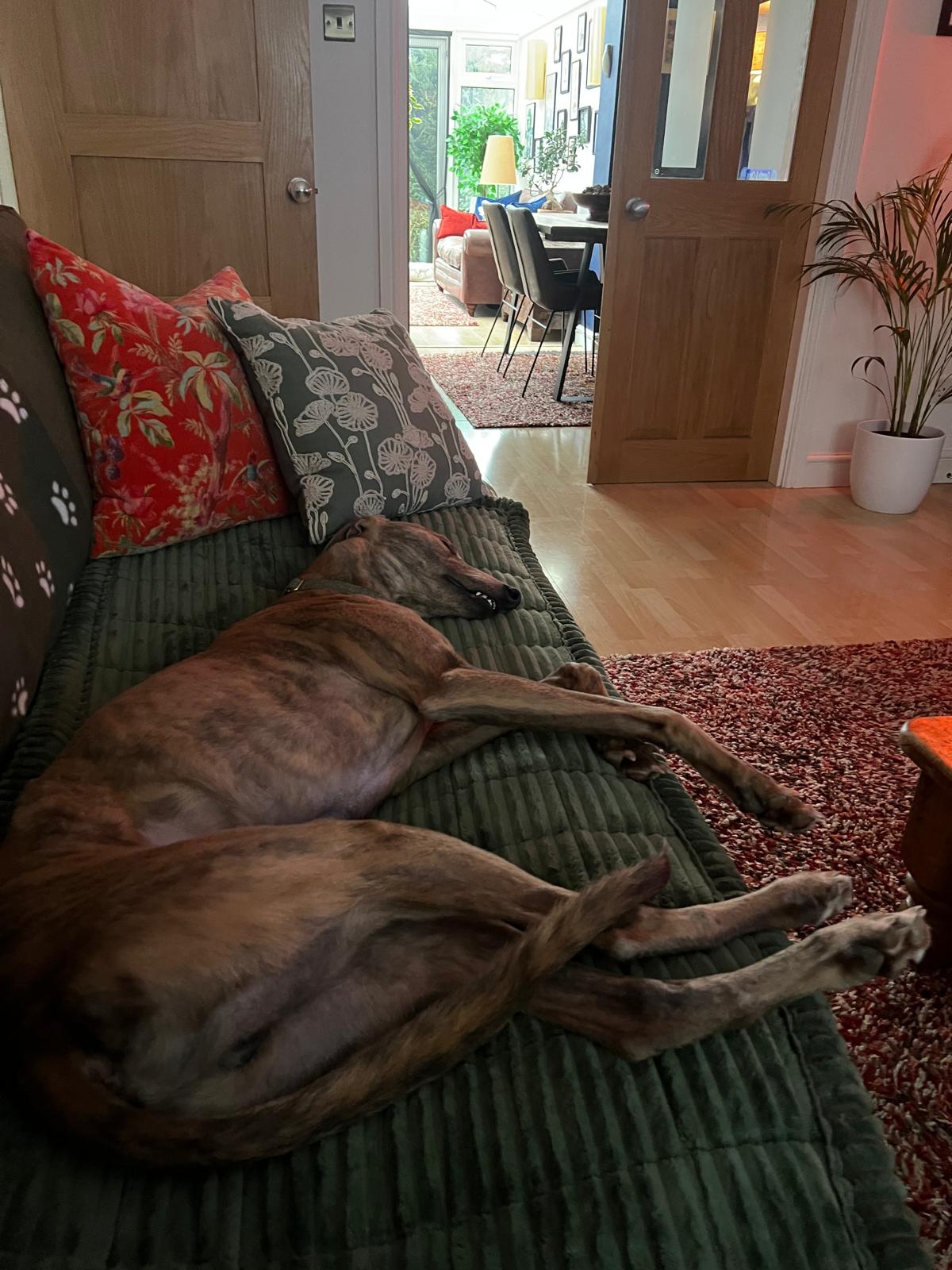 Nicknamed 'no Drama' in kennels, this beautiful blue brindle boy has just the most laid back & loving character. We knew he would fit nicely into their lifestyle (which includes regular visits to spend time with Dan at the local pub) but would he settle into homed life ?