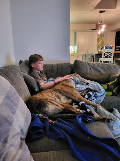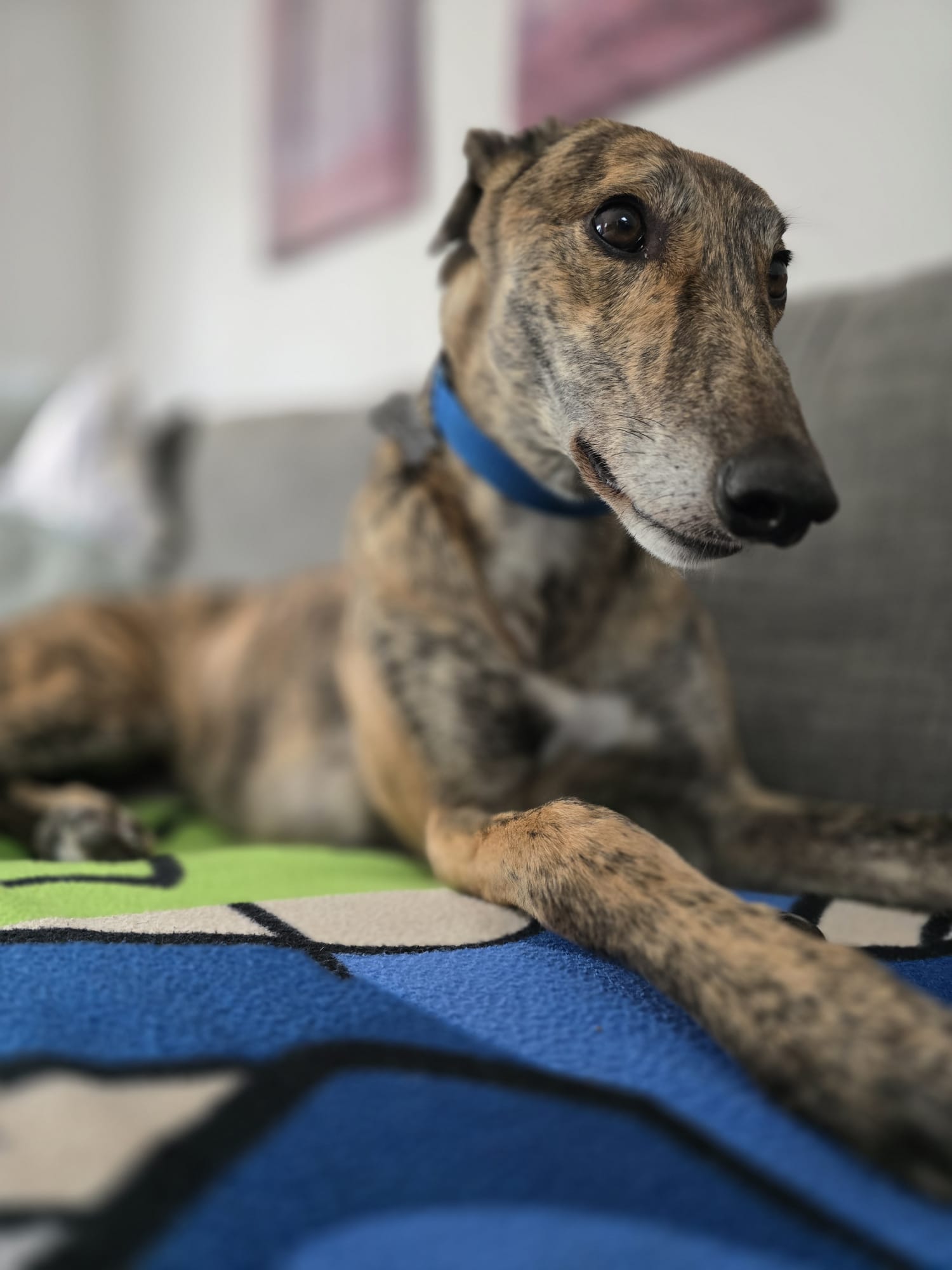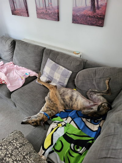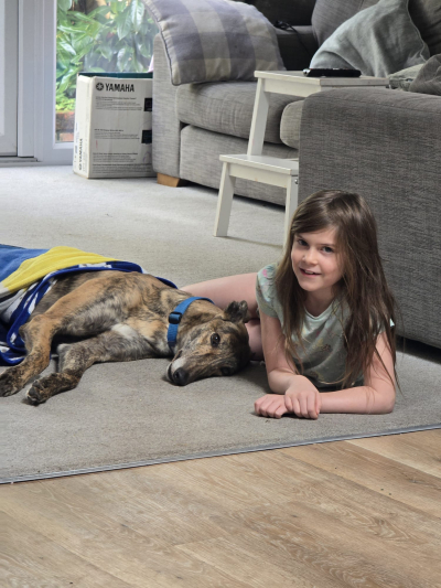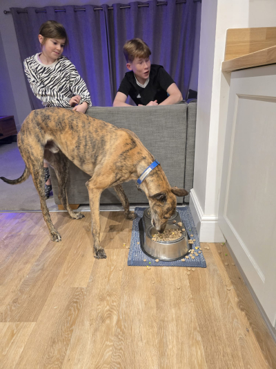Neil and his lovely family came along to meet him and we had our fingers crossed firmly for our beautiful brindle boy.  Embarking on our standard Foster To Adopt procedure, we were delighted to receive the fantastic news that Gadget had settled in and was home to stay.